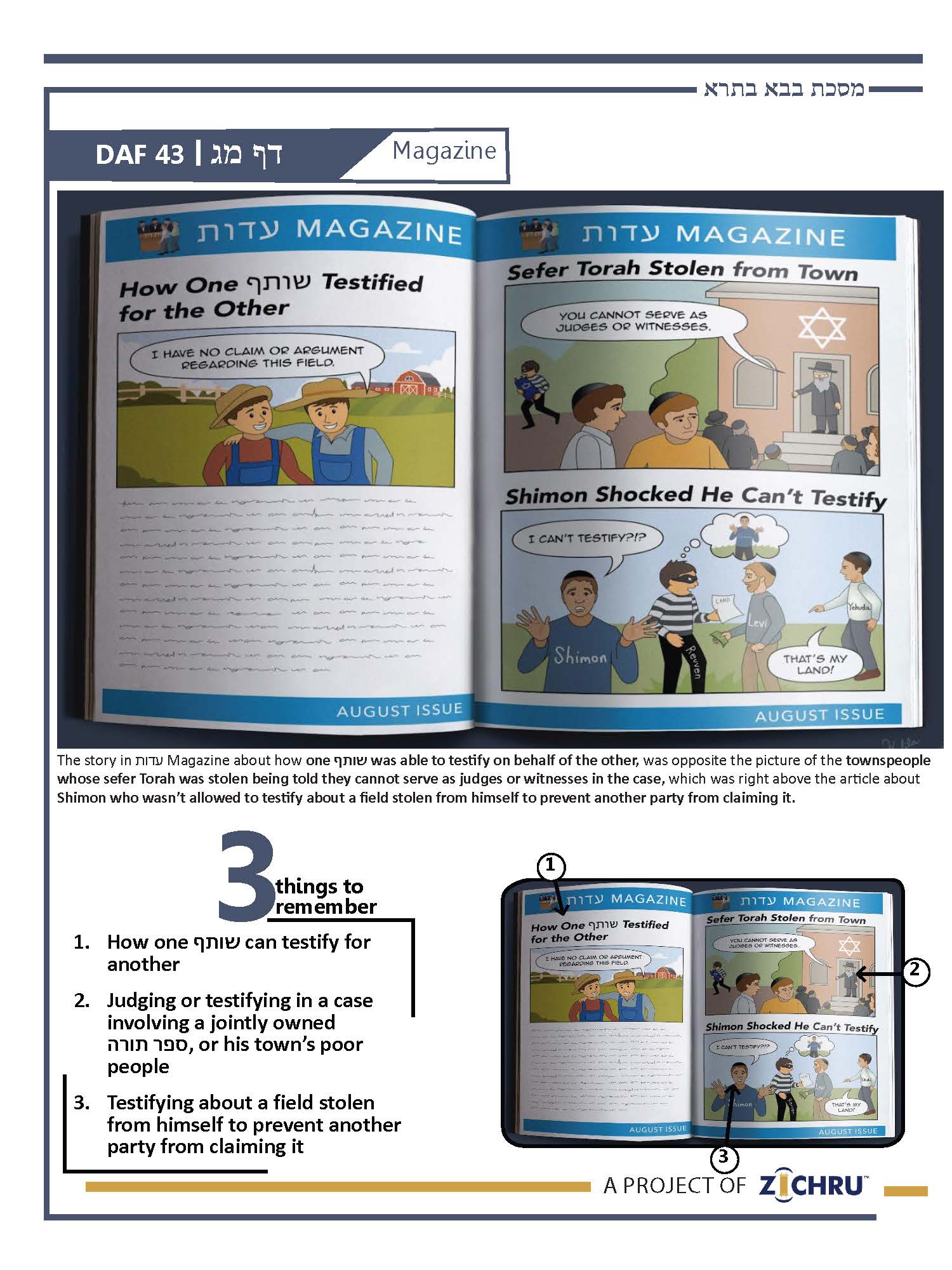 The story in עדות Magazine about how one שותףwas able to testify on behalf of the other, was opposite the picture of the townspeople, whose Sefer Torah was stolen, being told they cannot serve as judges or witnesses in the case, which was right above the article about Shimon who wasn’t allowed to testify about a field stolen from himself to prevent another party from claiming it.