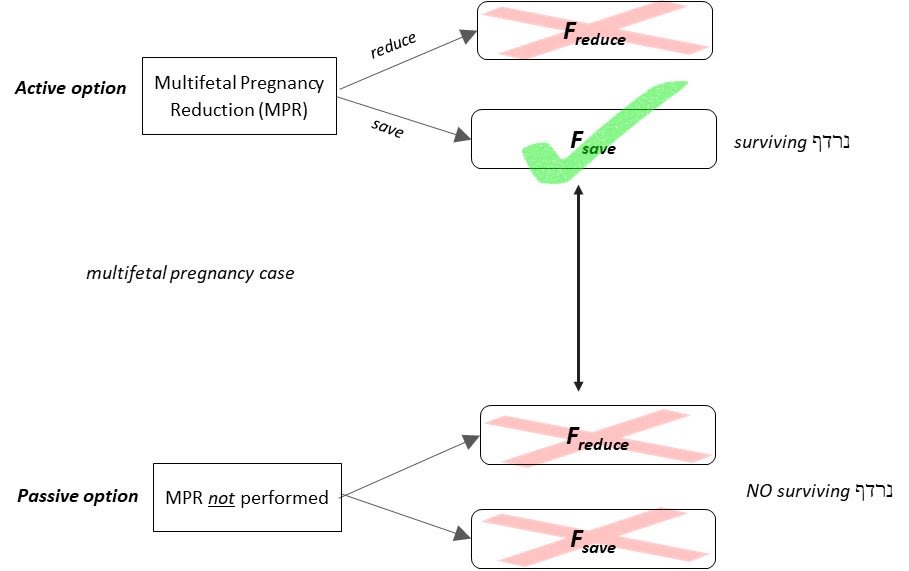 Figure 6: Multifetal pregnancy (MFP) case: If the passive option is chosen, there will not likely be any הצלת הנרדף since there is a high risk of total fetal/neonatal death. Only if the active option (MPR) is chosen, some of the fetuses (Fsave) will survive at the expense of the other fetuses (Freduce).