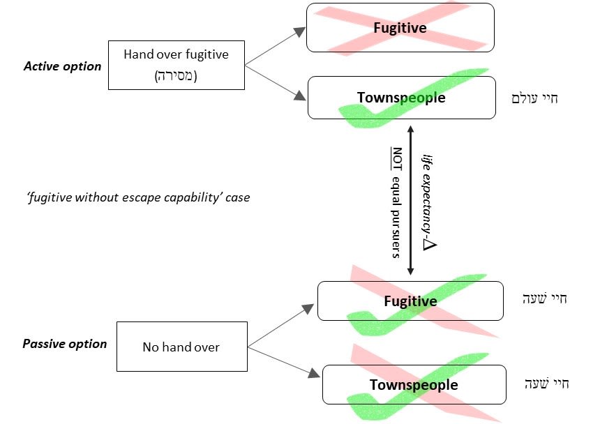 A. Perhaps we can answer that in the ‘fugitive without escape capability’ situation, even though there would be no survivors if the passive option was chosen, nonetheless, the fugitive would still have חיי שׁעה remaining until the hooligans invade and kill everyone, which he stands to lose if the townspeople hand him over. Therefore, if not for the life expectancy-D between the townspeople’s חיי עולם and the fugitive’s חיי שׁעה, we would still have the same dilemma as in the ‘fugitive with escape capability’ situation: If we choose the active option, the fugitive will lose his חיי שׁעה and if we choose the passive option, the townspeople will lose their חיי עולם. Accordingly, we would have reasoned since we can fulfill הצלת הנרדף through the passive option, i.e., temporarily extending the life of the fugitive, we must remain passive rather than performing an act of שׁפיכת דמים. Only because of the life expectancy-D, we can say that the respective pursuits of the “opposing parties” are not equal and therefore, the “משׁמיא קא רדפי לה” concept will not apply.
