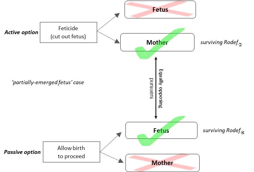 | Obstructed labor | ‘non-emerged fetus’ | Mother’s complete נפש | Fetus’ incomplete נפש | Yes | D between the mother’s complete נפש and the fetus’ incomplete נפש | No | The fetus is considered the “definitive רודף" because of the נפשׁ-D |
