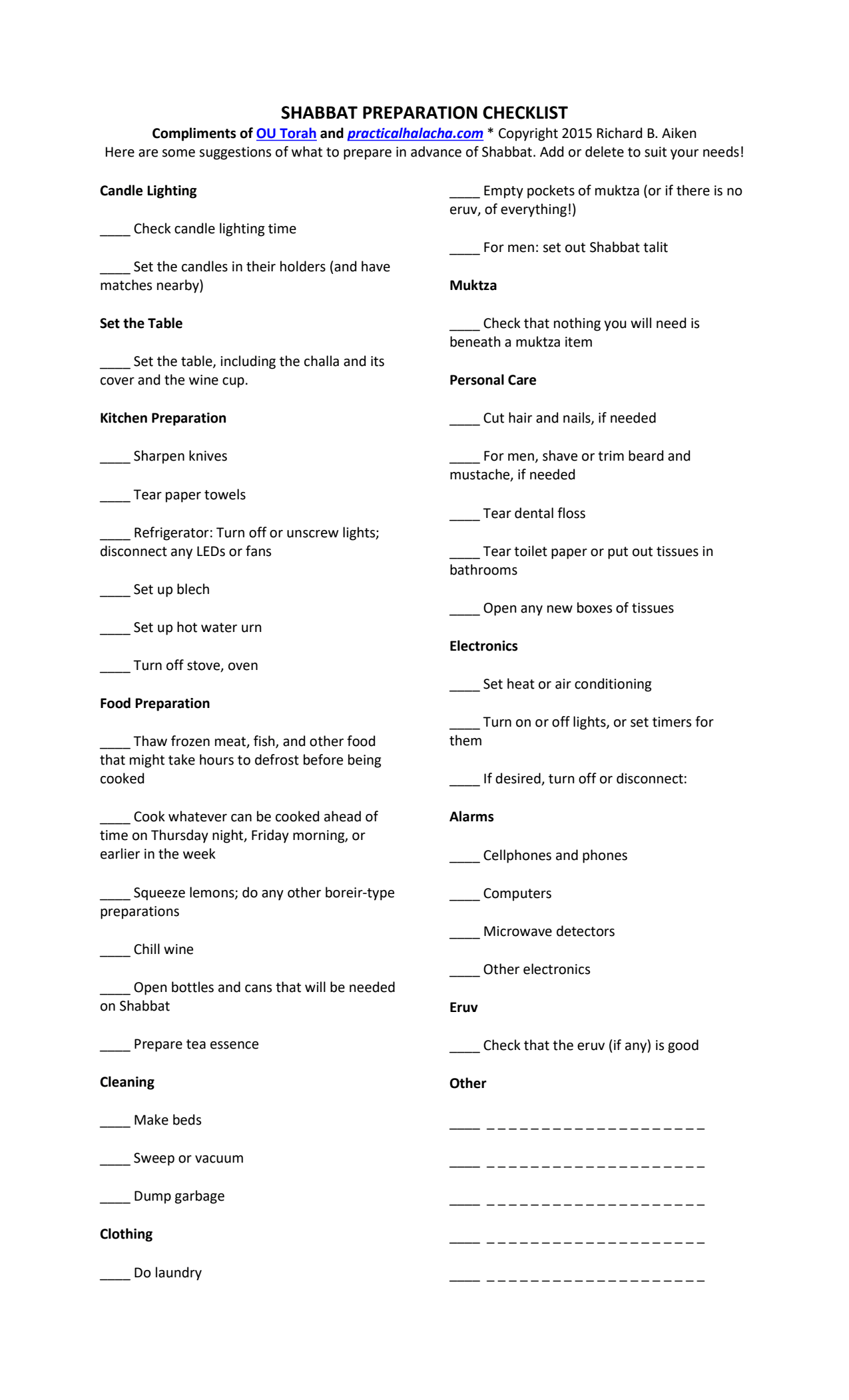 Shabbat Preparation Checklist