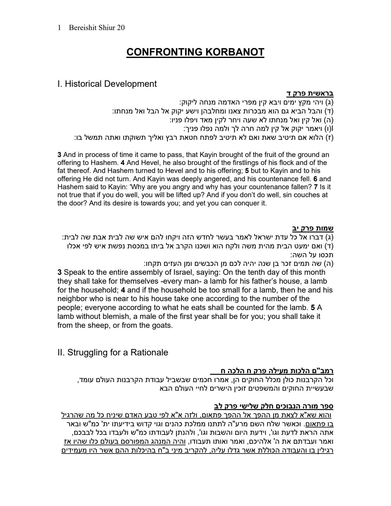 Hashem turns to Hevel and his korban but not to Kayin and his korban - God's response is not to the ritual but to the person. What is God looking for at the moment? Korbanot evidently develop as something man initiates, not God. This changes with the Korban Pesach.