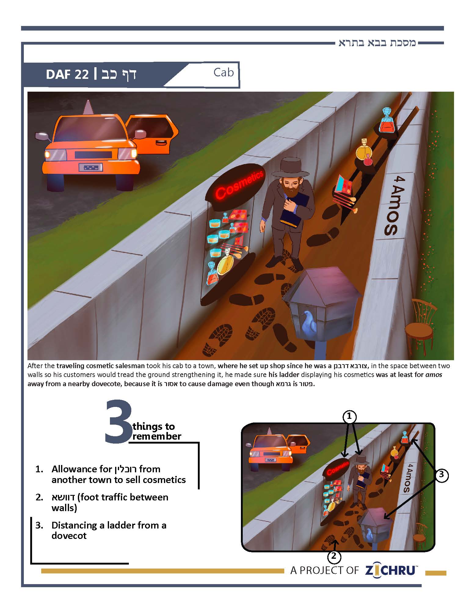 After the travelling cosmetic salesman took a cab to a town, where he set up a shop since he was a צורבא מרבנן, in the space between two walls so his customers would tread the ground strengthening it, he made sure his ladder displaying his cosmetics was at least four amos away from a nearby dovecote, because גרמא בניזקין אסור although he is patur from paying.